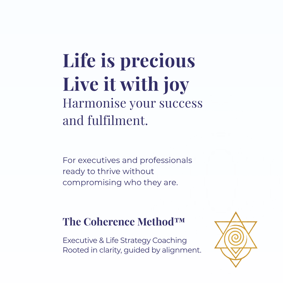 There comes a moment when achievement alone is no longer enough. In a world that rewards doing, performing, and providing, many high-achieving professionals quietly carry a growing dissonance. The Coherence Method™ was created for that turning point – guiding accomplished professionals to reconnect with their inner rhythm, align with purpose, and lead from coherence, where clarity and fulfillment naturally unfold. It helps you realign how you think, how you feel, and how you act – uniting strategy, neuroscience, and presence so that success feels whole, sustainable, and true. It’s my signature coaching approach, developed over 15 years of transformational work across industries and cultures – infused with both deep personal transformation and strategic insight.
