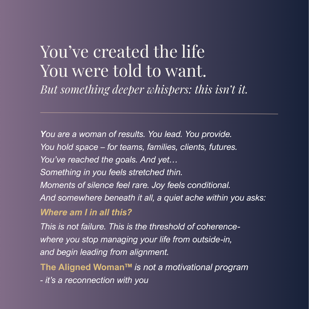 The Aligned Woman™ is a personal coaching journey for successful women who feel something is still missing. You’ve achieved so much, but now you’re ready for more than just external wins – you want inner peace and true fulfillment. This isn’t a one-size-fits-all program. It’s a tailored experience, designed to help you reconnect with yourself, find balance, and elevate your life from the inside out.