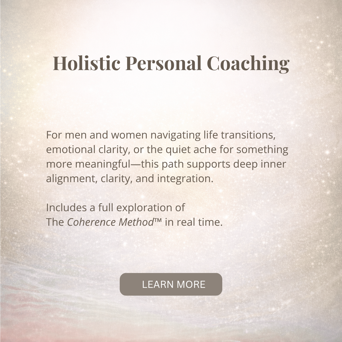 Whether you’re at the height of your career or sensing the quiet pull toward something more meaningful, The Coherence Method™ offers a grounded, strategic, and transformational path forward.